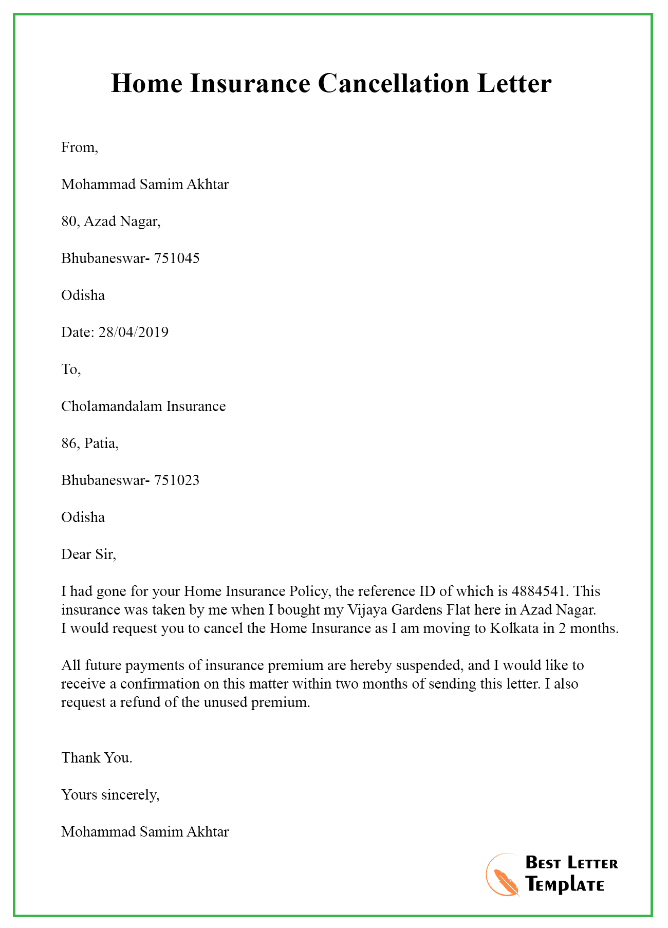 Free Home Insurance Cancellation Letter Templat…